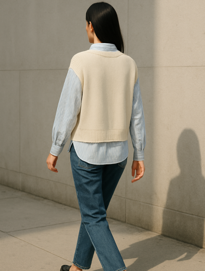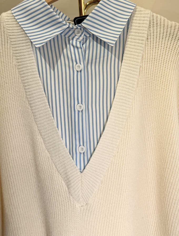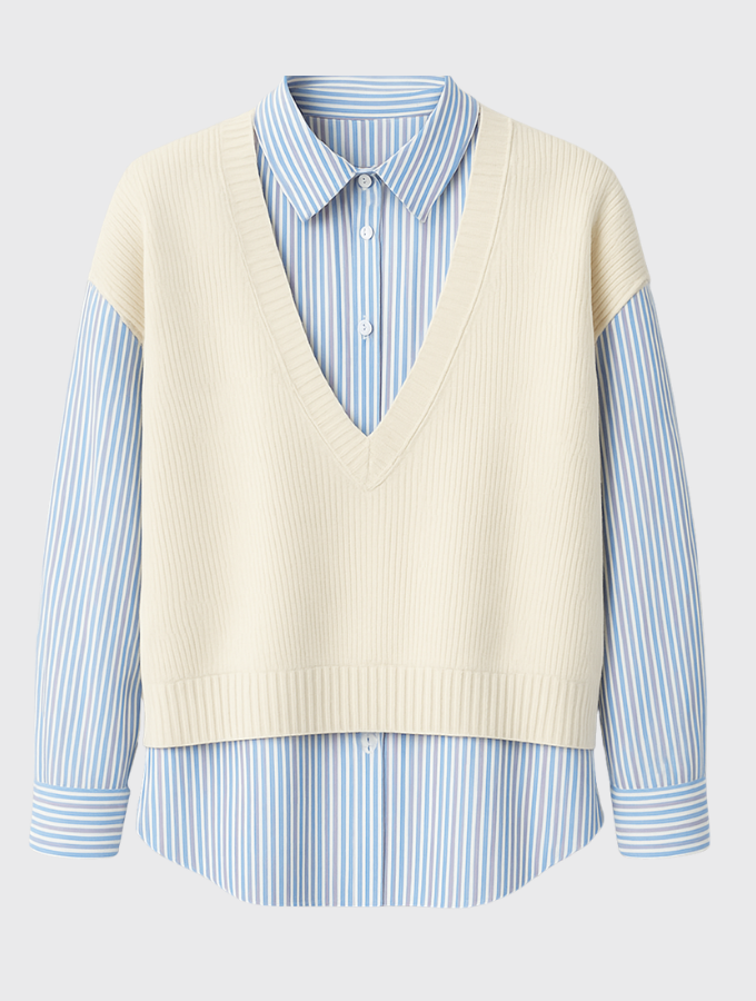 Camisa de corte relajado que simula un look de capas, compuesta por una camisa celeste de rayas blancas con cuello clásico y puños estructurados, sobre la que se superpone un chaleco tejido en punto canalé de color crudo. El chaleco tiene escote en "V" profundo y un diseño ligeramente boxy que da la apariencia de una sobreposición sin volumen adicional. La camisa sobresale en el bajo y en las mangas, aportando dimensión y un contraste textil. Ideal para lograr un look preppy, moderno y pulido sin esfuerzo.
