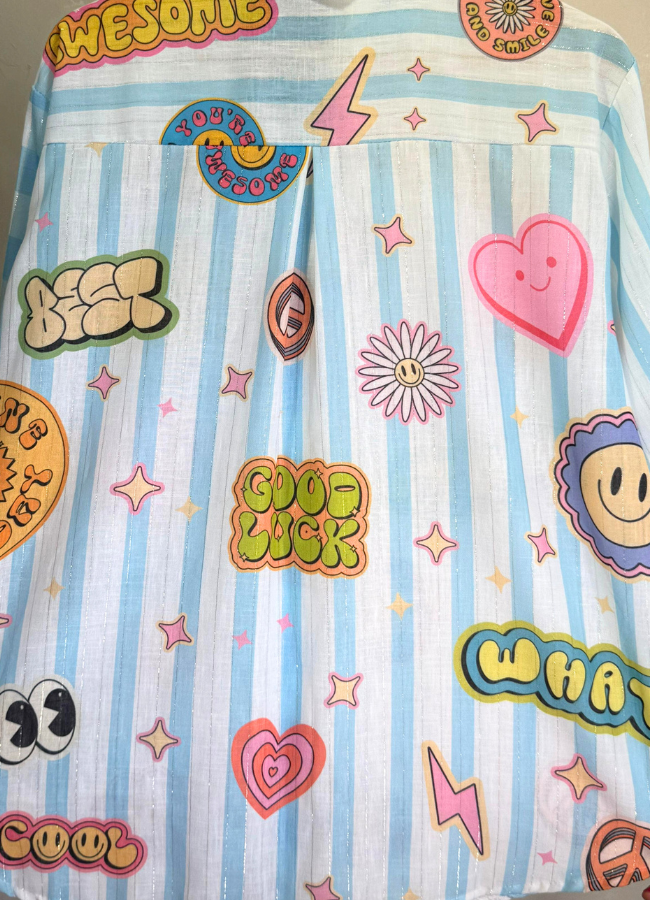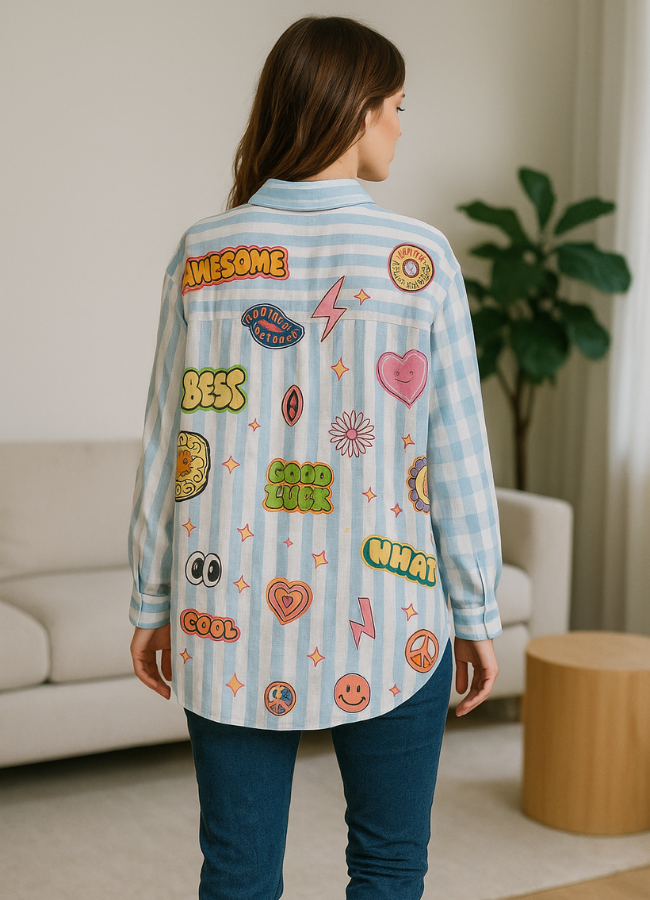Camisa de mujer confeccionada en una base de algodón liviano, con patrón a rayas verticales en tonos azul claro y blanco. Está intervenida completamente con ilustraciones y parches estampados estilo cómic/pop art en el frente, la espalda y las mangas, destacando elementos gráficos como flores, corazones, caritas felices, estrellas, relámpagos y palabras como “AWESOME”, “GOOD LUCK” o “COOL”.