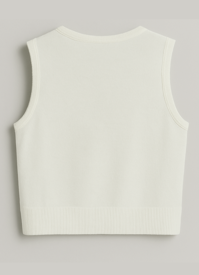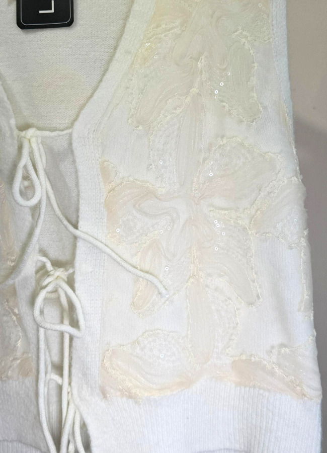 Chaleco tejido en mezcla de algodón con poliéster, color marfil, con aplicaciones florales en relieve tipo 3D bordadas en toda la superficie. Presenta escote en V profundo, cierre frontal con tres lazos ajustables y ribete acanalado en la parte inferior para una mejor estructura. Su fit semi-ajustado resalta la silueta sin perder comodidad, convirtiéndolo en una pieza versátil y sofisticada.