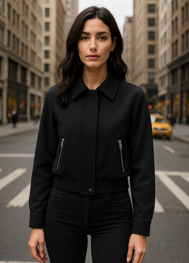 Chaqueta estilo bomber en color negro, con silueta estructurada y diseño minimalista. Presenta cuello clásico tipo camisa, cierre frontal oculto por tapeta y dos bolsillos verticales con cierre metálico expuesto. La cintura está terminada con un elástico ancho acanalado que aporta ajuste y forma, al igual que los puños, que incluyen broches metálicos decorativos. El diseño limpio y contemporáneo combina detalles utilitarios con un acabado elegante, ideal para climas medios.
