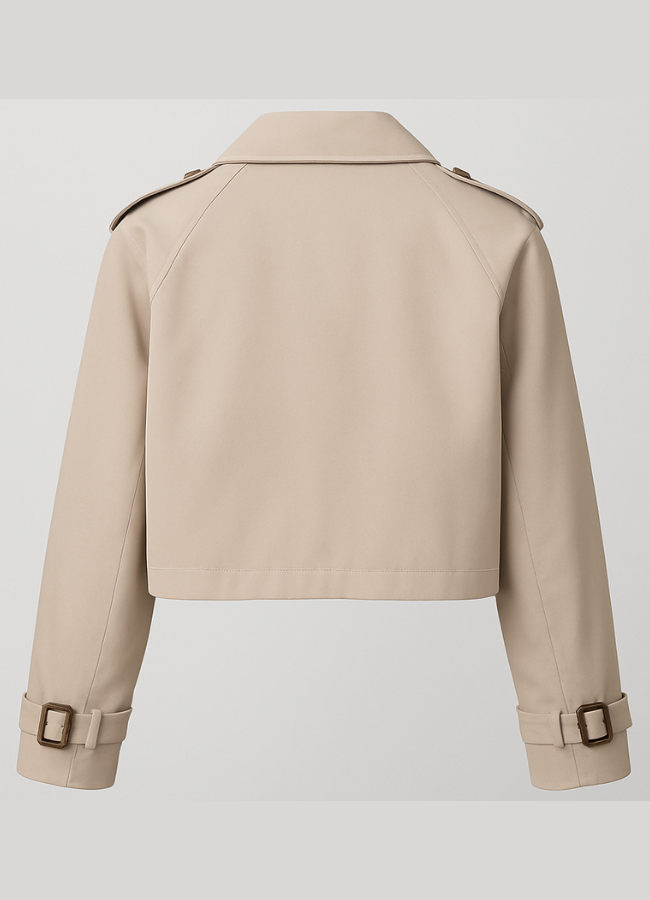 Chaqueta de mujer tipo trench en versión corta, confeccionada en mezcla de poliéster de estructura media, ideal para climas frescos. Presenta cuello solapa amplia y doble abotonadura frontal con cuatro botones visibles en tono caramelo.
