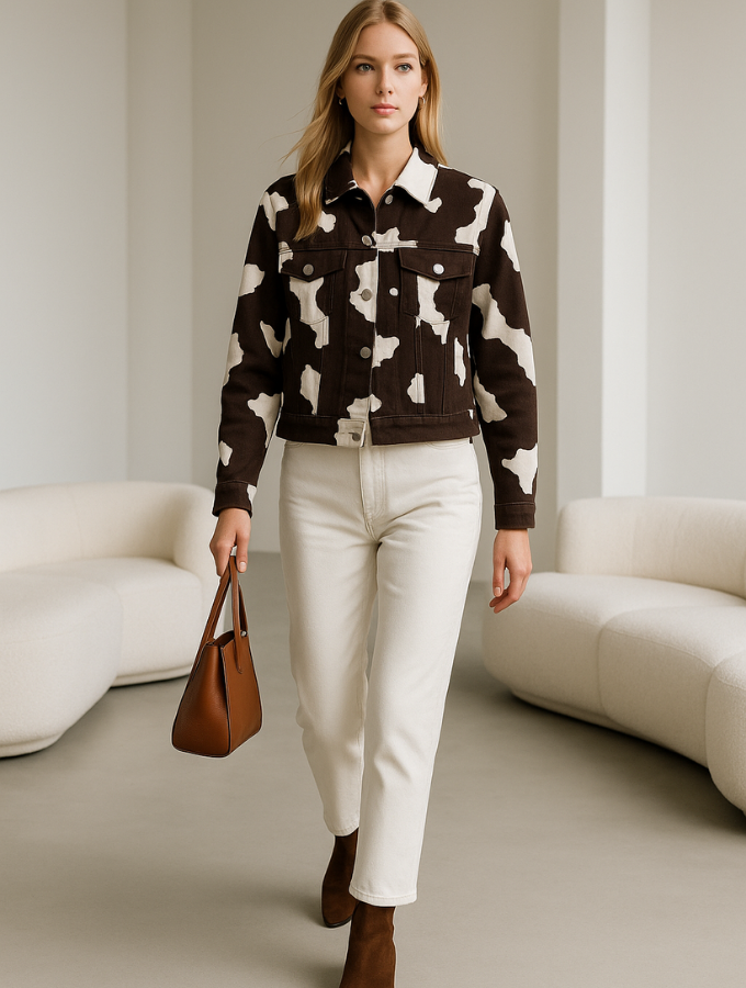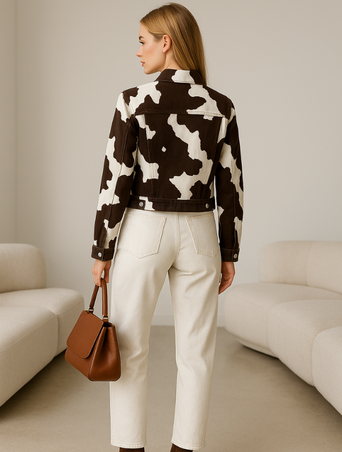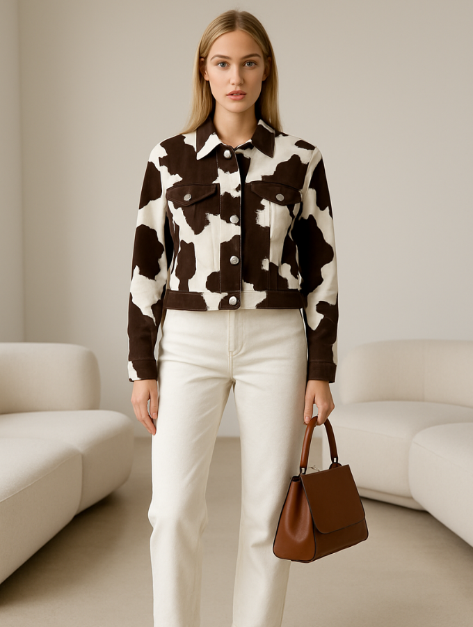 Una pieza audaz y auténtica que redefine el denim clásico. Esta chaqueta tipo trucker con corte cropped y estructura rígida presenta un estampado digital cow-print que aporta personalidad y estilo. Con cuello camisero, hombros ligeramente caídos y costuras en contraste, su diseño mezcla lo rural y lo urbano con equilibrio perfecto. Los botones metálicos plateados, bolsillos con solapa y detalles funcionales en la parte posterior completan esta prenda versátil y de fuerte presencia.