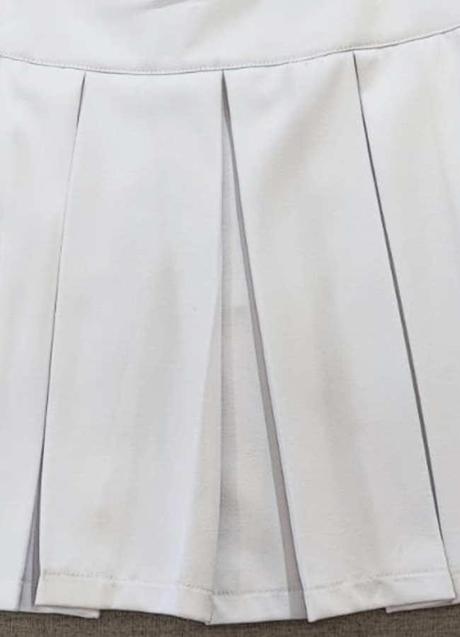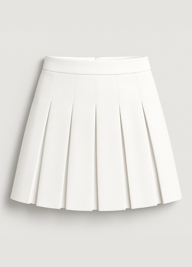 Falda corta en color blanco con diseño estructurado de tablones anchos y uniformes alrededor de toda la prenda. Cuenta con una pretina plana en la parte superior que define la cintura y aporta estructura. El corte es en línea A, permitiendo una caída fluida con movimiento. El diseño está inspirado en las faldas tipo colegiala, con un estilo limpio, simétrico y juvenil. Cierre posterior invisible que mantiene la estética pulida.