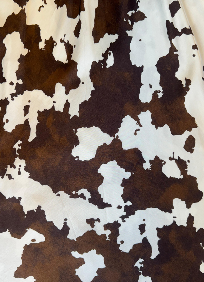 La falda “Cow Évasion” destaca por su original estampado tipo vaca en tonos blanco crudo y marrón oscuro, una pieza versátil que aporta carácter y estilo al armario femenino. Confeccionada en una mezcla de viscosa y poliéster de peso medio, esta falda midi de silueta evasé ofrece una caída fluida y movimiento natural. Su pretina elástica proporciona ajuste cómodo sin cierres ni forro, manteniendo una estética limpia y minimalista. Perfecta para looks de lujo cotidiano: combínala con camisetas neutras, tops estructurados o suéteres delicados según la ocasión.