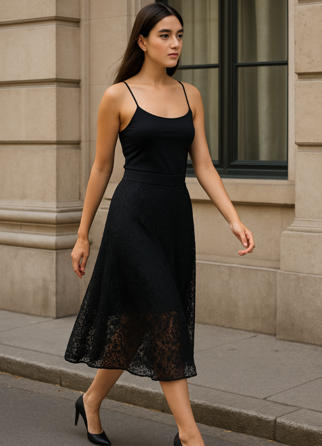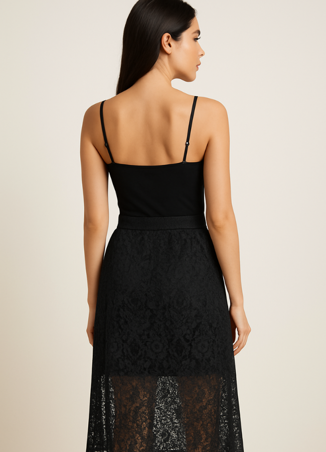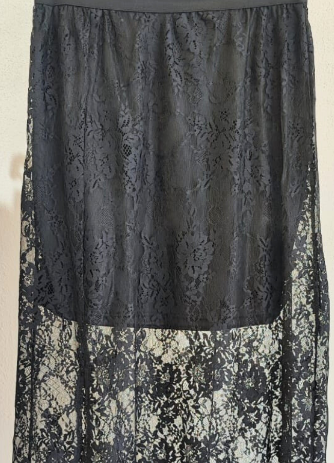 Falda de largo midi en color negro, confeccionada en encaje floral delicado. Presenta un diseño de doble capa: una base interna opaca hasta el muslo y una capa superior de encaje que se extiende hasta el bajo, generando un efecto de transparencia elegante en la parte inferior. La pretina elástica plana asegura un ajuste cómodo y discreto. El acabado del bajo incluye una ligera forma ondulada con terminación de encaje.