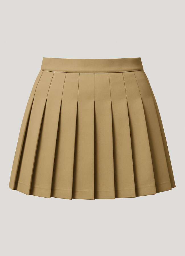 Falda corta en tono camel con diseño estructurado de tablones amplios distribuidos de forma simétrica alrededor de toda la prenda. Cuenta con una pretina rígida que define la cintura y favorece el ajuste. Su silueta en línea A permite una caída armónica con movimiento. El diseño evoca el estilo colegial clásico, con un acabado pulido y versátil. Cierre invisible en la parte posterior para un acabado limpio.