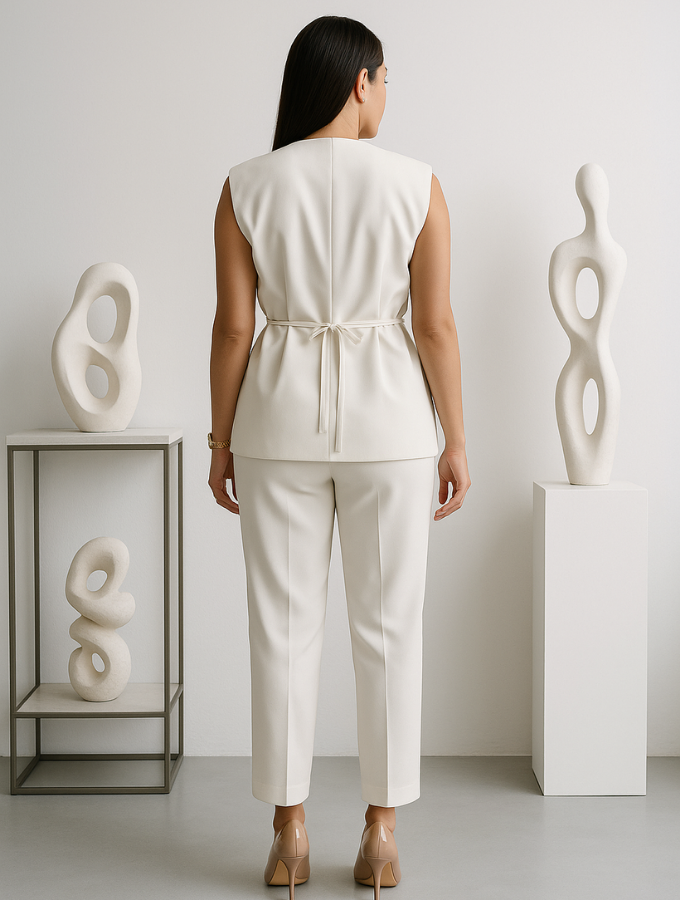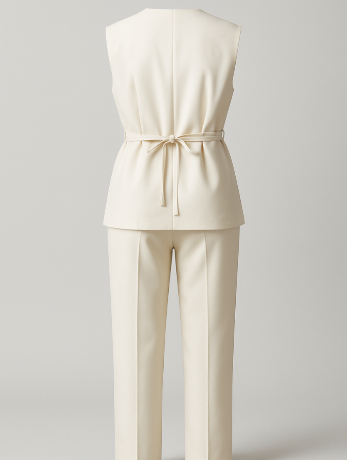 El conjunto Flor de Crema está compuesto por un chaleco sin mangas tipo blazer y pantalón recto en tono marfil cálido.