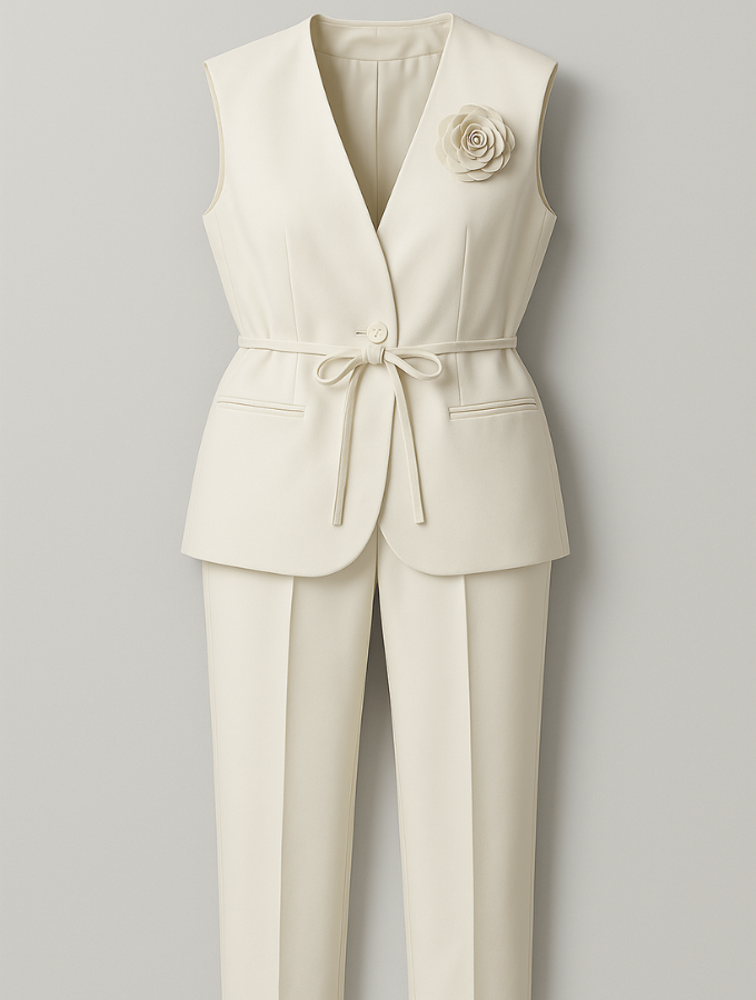 El chaleco, con escote en V y botonadura sencilla, incluye una cinturilla delgada ajustable que define suavemente la figura, y una flor desmontable que adorna el hombro con un toque escultórico y romántico.
