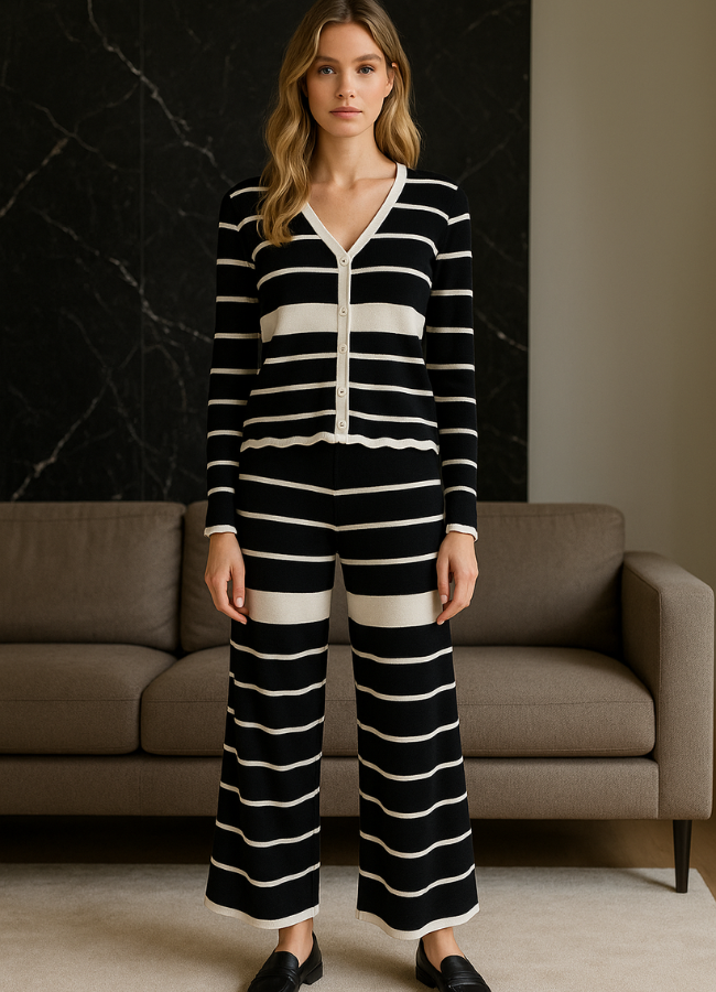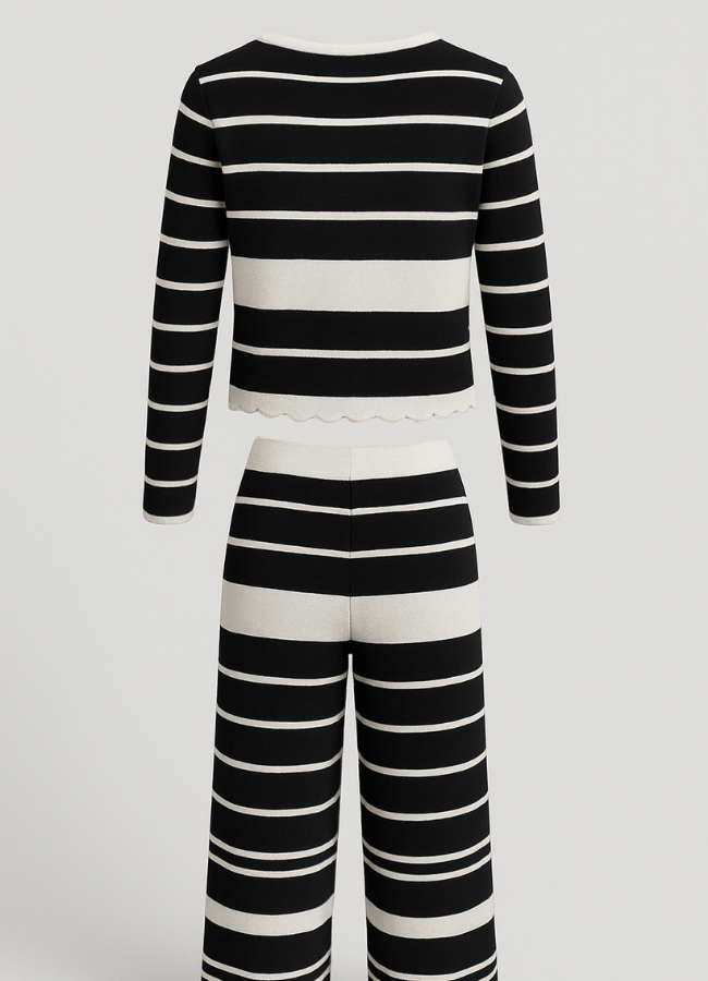 Set compuesto por un top de manga larga y un pantalón de pierna ancha, ambos en tejido de punto con diseño de rayas horizontales en blanco y negro. El top tiene corte recto y largo cropped, con cuello redondo y terminación inferior con delicado borde ondulado. Las mangas son largas y ajustadas, siguiendo el patrón lineal del diseño. El pantalón es de tiro alto, con pretina elástica y caída fluida, aportando comodidad y movimiento. Las líneas del diseño están alineadas para dar continuidad visual entre ambas piezas, logrando un efecto armónico y moderno.
