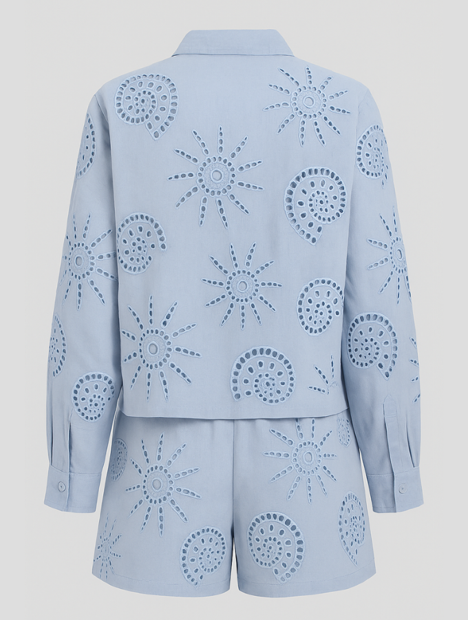 Confeccionado en lino mezcla de tacto ligero y fresco, este set de camisa y short se distingue por su bordado calado tipo ojo de sol y caracol, distribuidos con precisión en toda la superficie.