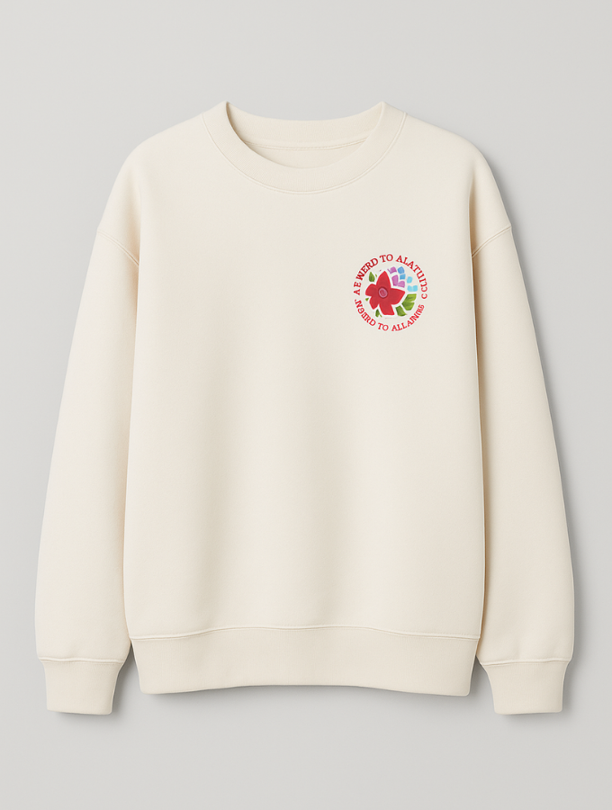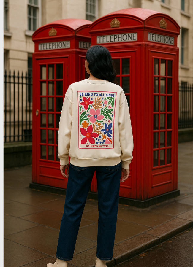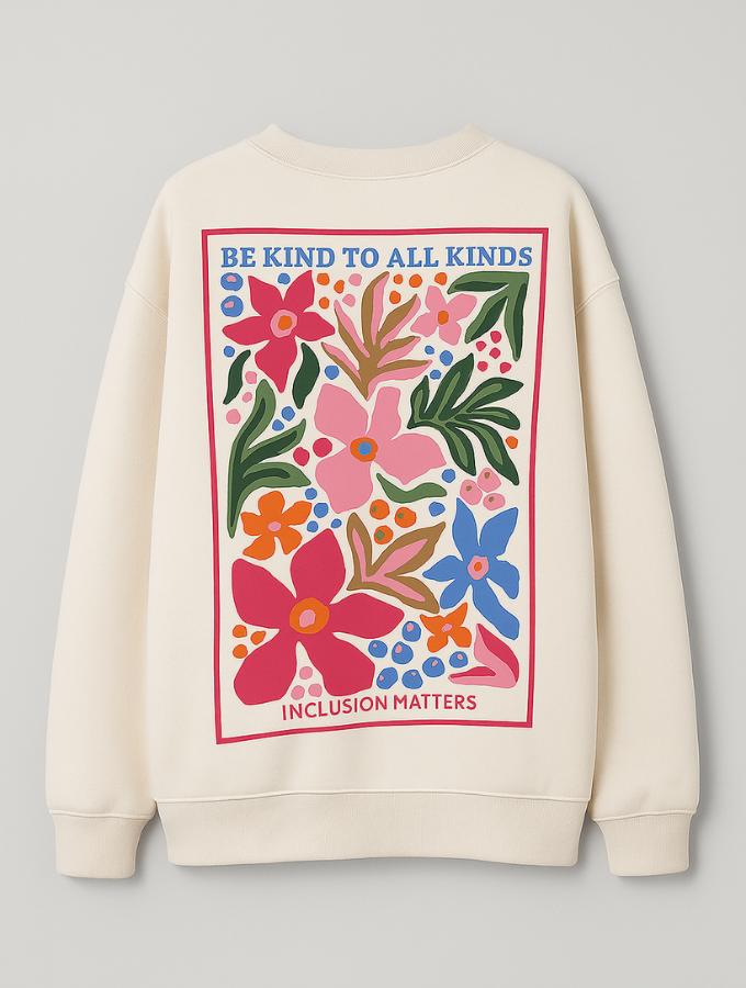 Sudadera tipo sweatshirt de corte clásico, confeccionada en algodón perchado de tacto suave. De color crudo, esta prenda presenta un bordado frontal pequeño con flor roja y frase, y un diseño en DTF a gran escala en la espalda con mensaje: “Be kind to all kinds – Inclusion Matters”.